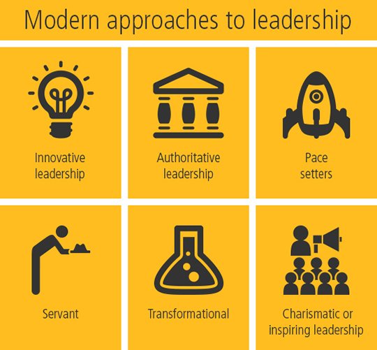 The image above from Bled School of Management outlines the six modern leadership approaches. Here’s a closer look at each leadership style from left to right: