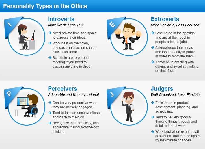 I did have a many obstacles to overcome in my transition, however, we eventually become the #1 team in that branch of our department after while. We also had ROCK STAR team members that really excelled in the position. It was a matter of identifying what worked with this specific team and finding an approach that catered best to them. Below is a look at personality types in the office and how we can further set our employees, and ourselves up for success: